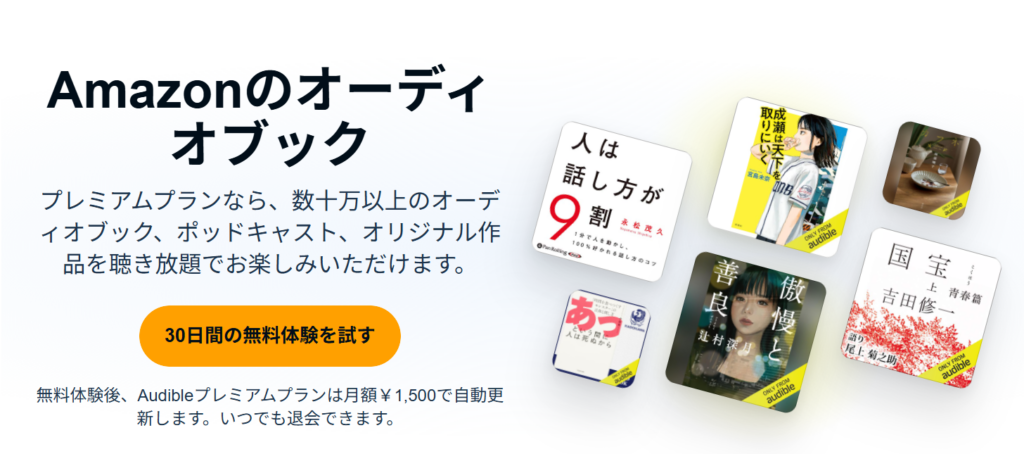 無料体験を活用すればリスクもありません。まずは一冊、耳で読書を始めてみましょう。はじめてのオーディブルなら入会から30日間無料、いつでも退会できます。再登録の方なら3ヶ月50%引きになることも。